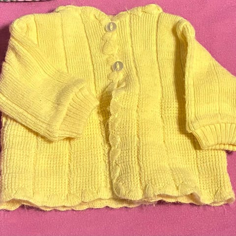 Strikket tøy til babydukker. Strikket en gang på slutten av 70-tallet/begynnelsen av 80-tallet. Har aldri blitt brukt og er som nytt. Meget pent håndarbeid. Detaljert og nydelig mønster. Selges for 250,- pr sett eller samlet for 600,- Passer en BabyBorn dukke i str vil jeg tro, kanskje litt mindre.