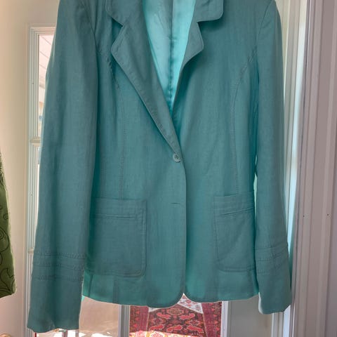 Nydelig lyse blå/turkise farget sateng blazer fra Ricco Vero str 36. Modellen heter Ricco Vero Sammy Blazer og koster kr 2.400 i butikk.