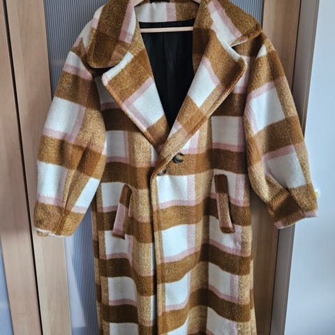 Jakken er lang med fine detaljer i livet. Ikke foret. Det finnes også bukser til.