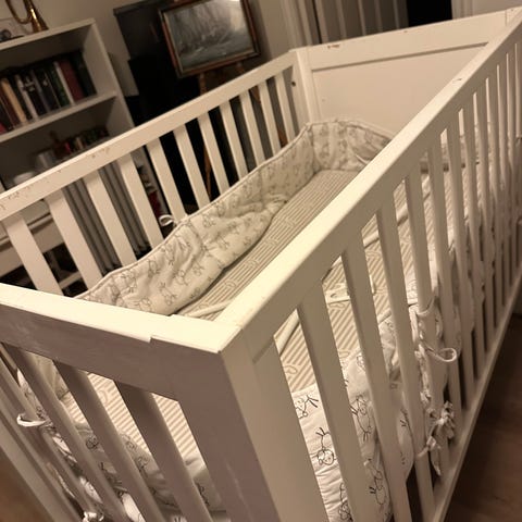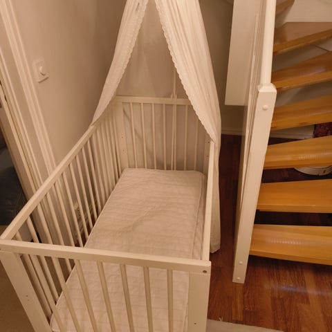 Fin barneseng laget av møbelsnekker. Madrass følger med.
