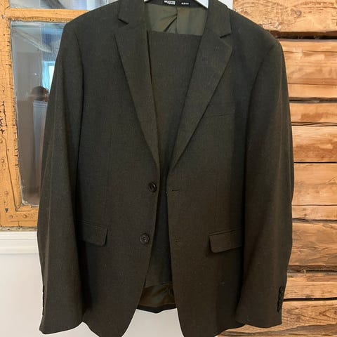 Følger med vest i lysere grå tone. Størrelse 50.