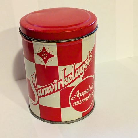 Pen retro Appelsinmarmelade blikkboks med lokk.