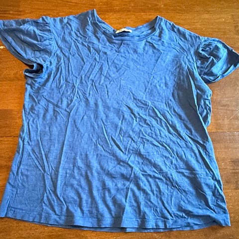 Møtk blå t-skjorte med trykk selges rimelig. Str. S, 100 % bomull. Pent og lite brukt.