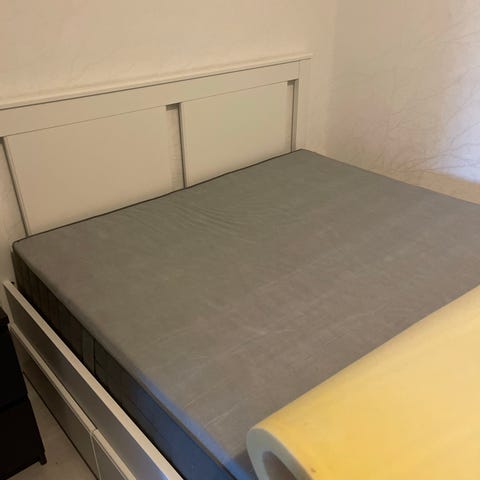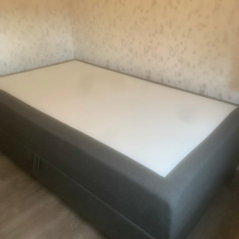 Fin seng selges. Den har to skuffer i svart med god plass til oppbevaring. God madrass kan følge med for 400kr ekstra..