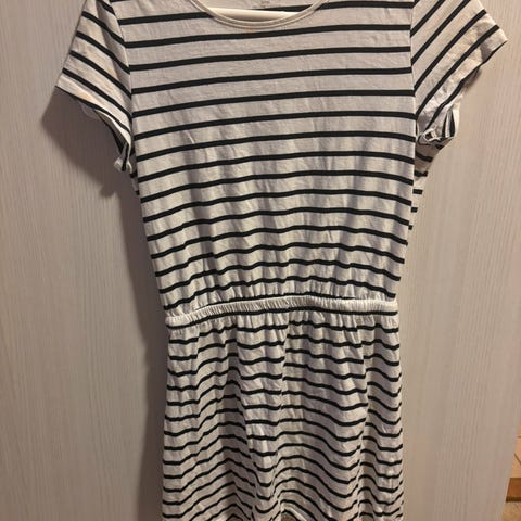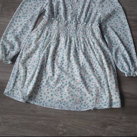 Omslagskjole, med strikk i midjen som gjør at man ikke kan åpne den helt.