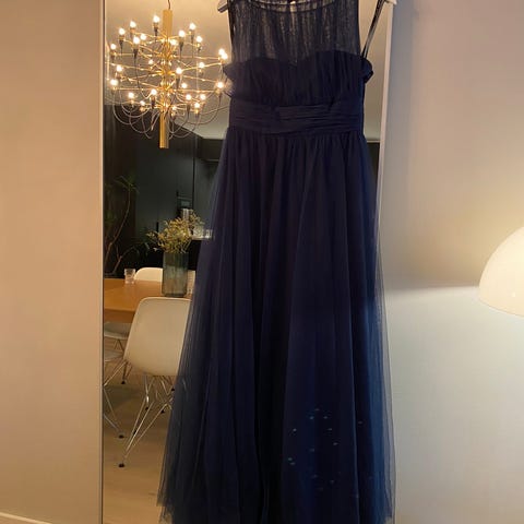 Enkel, pen og klassisk kjole fra Carla F. I mørkeblå farge. Lag over lag med tynt stoff. Foret inni og glidelås i siden. I normal bruksstand, se bilder.