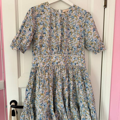 Lys blå kjole med blomster brodert på.