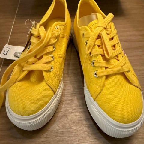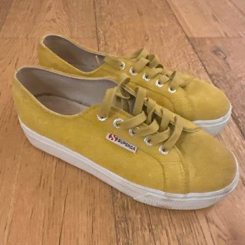 Lekre gule tøysko fra Superga selges. Str 40. Nesten ikke brukt.., se sålen..🫣 Ny pris 990,- , selges for 450,-