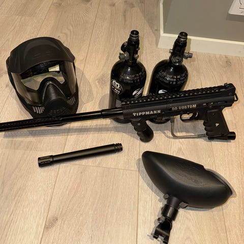 Komplett paintball pakke. Har vært strålende fornøyd med utstyret. En av de mest robuste og pålitelige markørene på markede. Uåpnet reparasjonskit, Maske med dobbelt glass. Med disse klærne forsvinner du godt i skogen.
