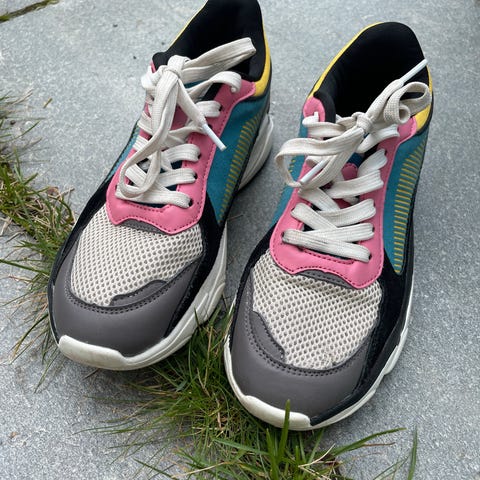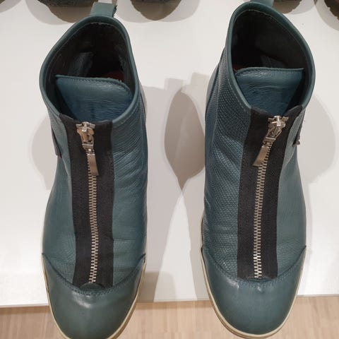 Kule sneakers i skinn og tekstil. Passert til det meste. Fin fargekombi av svart, grønn og røde lisser.