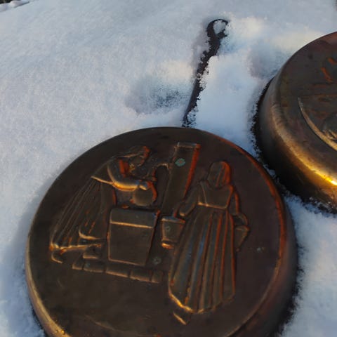 2 kobber gjenstander ( panner ) den største er 59 cm med hank , diameter 30 cm , høyde 7 cm . Den minste har messing håndtak , 41 cm med håndtaket , diameter 24 cm , høyde 9 cm . Selges samlet .