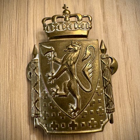 Emblem, våpenskjold til salgs. Rammen rund er i tre, selve våpenskjoldet er i bronse. Veldig tung, ca 14 kg.