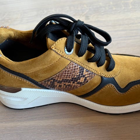 Nye sko i lærimitasjon og tekstil selges.