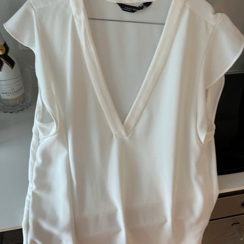 Flott hvit Zara bluse /topp/overdel uten ermer med knyting og flott slags legg foran. Str M men romslig i str. så vil si mere str L. Lite brukt. Kr 90. Har brukt kun bh under, men er kanskje en smule gjennomsiktig. Kan sendes 🍃🌼🍃evt avtale overlev Oslo.