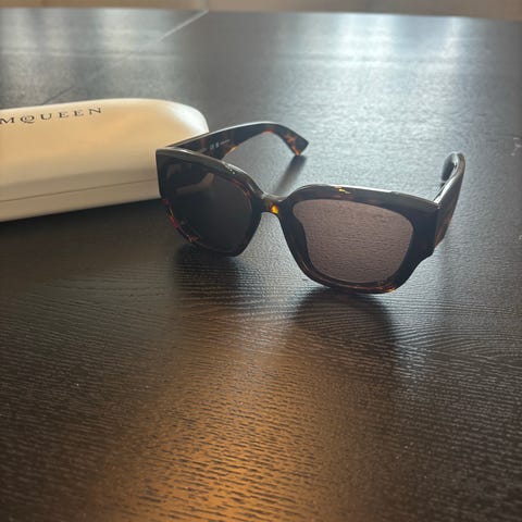 Saint Laurent SL68 solbriller med brun tortoiseshell innfatning. Kjøpt hos Krogh Optikk i 2021. Pent brukt, og i fin stand. Ingen riper i glassene. Det eneste jeg har å bemerke, er at enden av den høyre brillestangen ikke når helt ned til bordet når brillen ligger med stengene slått ut. Se bilde 8. Jeg har ikke lagt merke til dette før jeg skulle ta bilder, og dette er ikke noe som har praktisk betydning når man bruker brillene. Prisen er satt.
