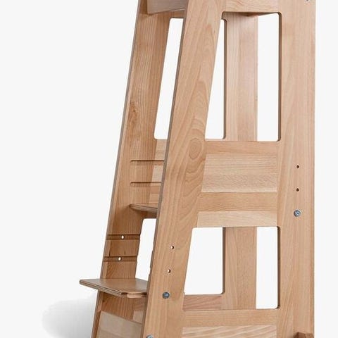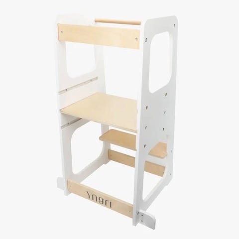 Kjøkkenhjelper: Dette kjøkkenhjelper for barn for å hjelpe dem med å rense hendene eller tennene uavhengig. Den har også en krittavle for å stimulere barnas interesse for å skrive og tegne. Om nødvendig kan du låse opp spennen og brette den for å gjøre den om til et bord med en benk. Dette settet gir på sin side ekstra plass for lesing eller skriving.