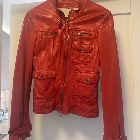Rød skinnjakke str. 36, brukt 2 ganger.