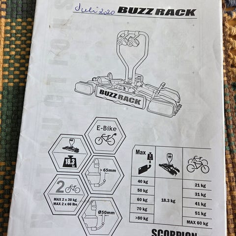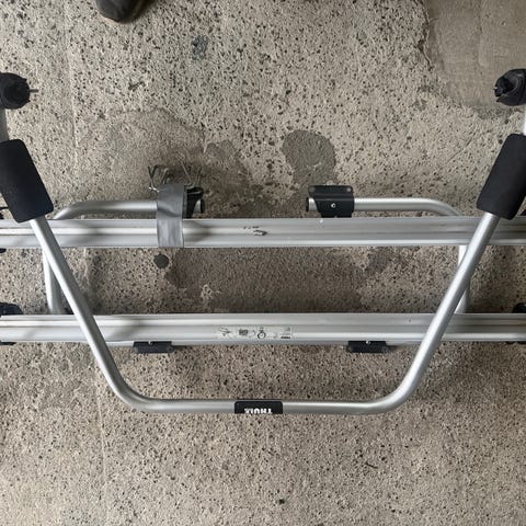 Plassbesparende enkelt men godt sykkelstativ, delbart med skilt og lysrampe. Lett å ta i bagasjerommet når det ikke brukes.