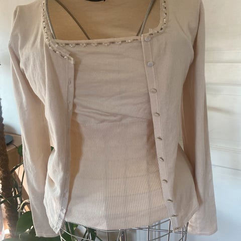 Tippen er i samme str, har små ermer og er avrundet nedentil; litt lengre bak enn foran gjør den ekstra kledelig , pris kr 75