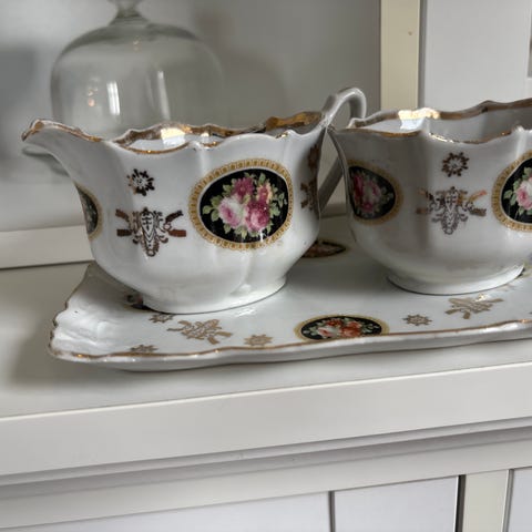Selger mitt gamle porselenssett til servering av frukt & bær m tilbehør. Vakker skål med gullstaffasje og lusterkant og herlig papegøyepar som dekor.