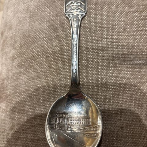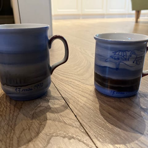 Flott Haugesund krus 1984 med Motiv av Bytunet ved det gamle politikammer og Smedasundet med Risøybrua og Bakerøybrua.