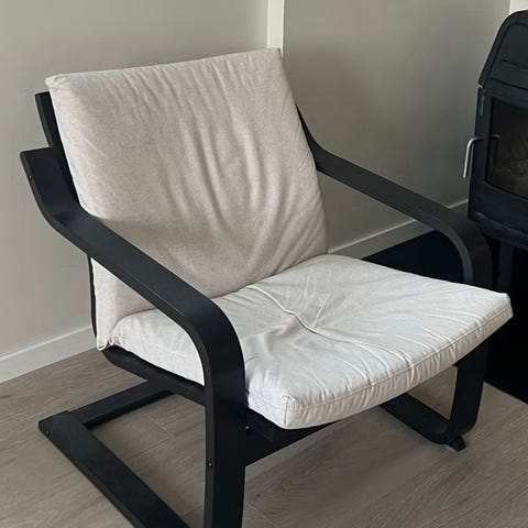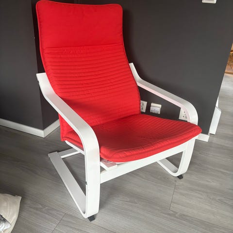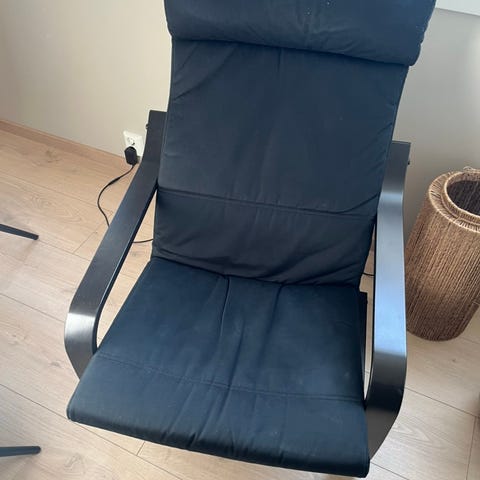 Svart lenestol fra Ikea av typen Poäng med rød pute. Har noen bruksmerker på baksiden, men ellers ingen skader og er pent brukt. Veldig behagelig å sitte i! Kan lett demonteres, men det må du gjøre selv. Hentes på Stavset.