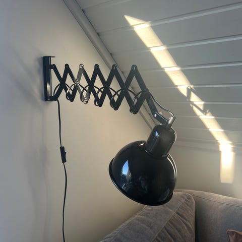 Kan trekkes ut fra veggen og vris i alle retninger for optimal lyssetting. Ny svart tekstilledning og støpsel. Bryter ved skjerm. Festes enkelt på vegg med skruer.