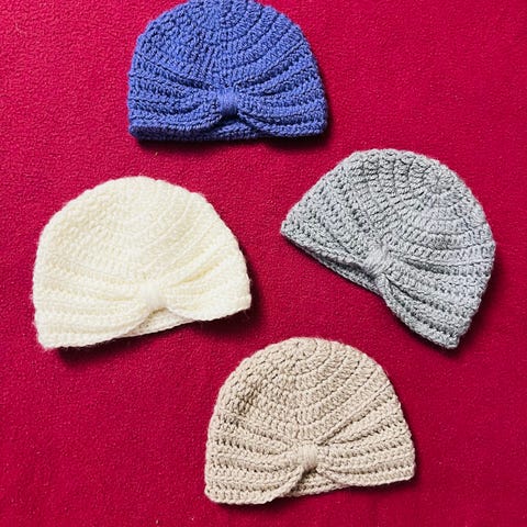 Nye, hjemmestrikkede luer til nyfødte babyer strikket i myk baby-bomull. Røykfritt. Dyrehårfritt. Parfymefritt.