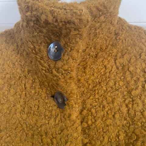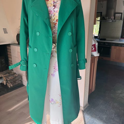 Trenchcoat i nydelig brunfarge med knepping, belte og lommer. Lengde fra skulder og ned: 118 cm