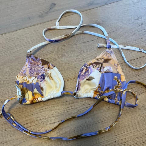 brukt en gang og vasket da det ble feil størrelse til meg - bikinitoppen har uttakbare innlegg og gulldetaljer på stroppene samt sømmene