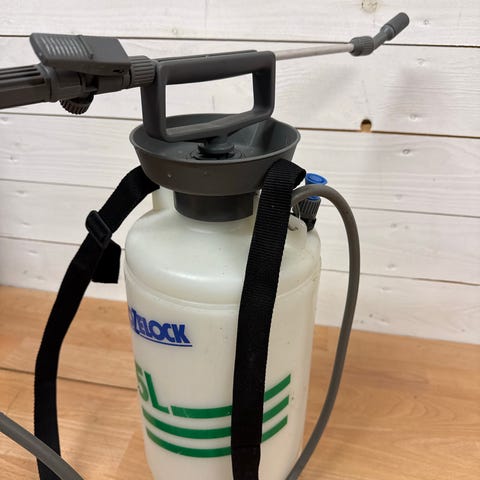 Velfungerende lavtrykksprøyte som pumpes opp. Passer for eks til utvendig husvaskmiddel.