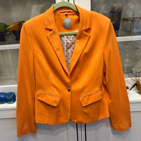 Jakken er nok M/L, selv om det står Medium i den. Jakken har knapp foran og 2 pyntelommer.