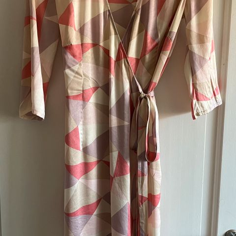 Mønstret nydelig knelang kjole fra Dea Kudibal 90% mulberry silke / 10% elasthan - str. XS. Knapp i ringningen og knepping på mansjettene. Strikk bak i ryggen, veldig fin på🌸 Dukken er en str 36/38 og kjolen er noe liten til bysten.