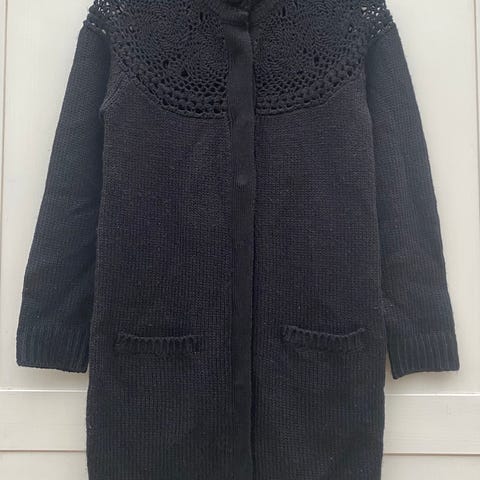 Flott cardigan i sort med påsydd pynt (applikasjoner).
