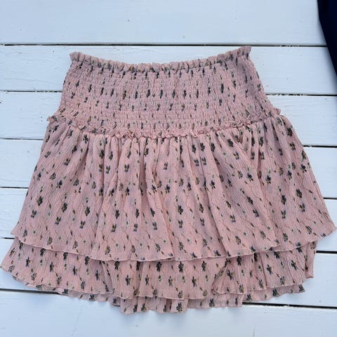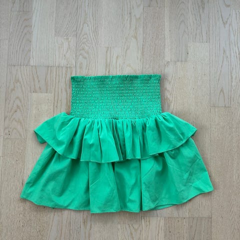 “Dette mini skjørtet har en lukking med glidelås i siden og en rynket søm på framsiden. Dette mini skjørtet finnes i grønt.”