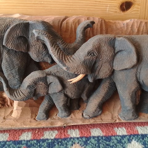 Treskjæring Elefant Familie Figur Sett i plasmatriale ser ut som Tre, håndlaget skulptur som viser en gruppe elefanter i ulike posisjoner. Figuren er laget av mørkt plast matreale ser ut som tre med detaljert utskjæring som fremhever elefantenes trekk og naturtro utseende. Passer som dekorasjon i hjem eller kontor. Fint om dere tar kontakt på 901 87 169 Mvh Anita