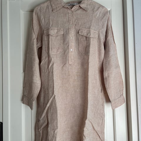 Klassisk, enkel kjole i lin. Den har splitter i siden. Kjolen er STOR i størrelsen. Den måler 55 cm under armene.