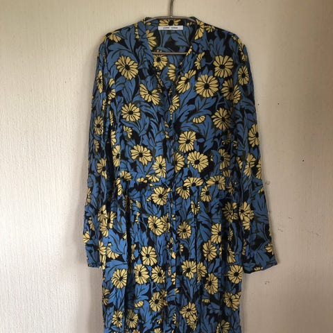 Dette er en kort kjole som kan brukes til mye Du kan pynte den opp ,med et skjerf eller et smykke i halsen eller en dress jakke til Den er kjøpt på høyer på Gulskogen og er i 68 prosent Polyester Litt Elastane 2prosent og en polyester C REC ICLADO) dette er en resirkulert polyester som er gjenbrukt i kjolen når de lagde den se egen lapp jeg har tatt bilde av så kan dere se selv Jeg har hengt opp et kjedet for og vise med fargen på kjolen