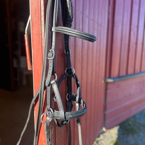 Ingen stener mangler på pannereimen og nesereimen er sydd med en pen hvit søm.
