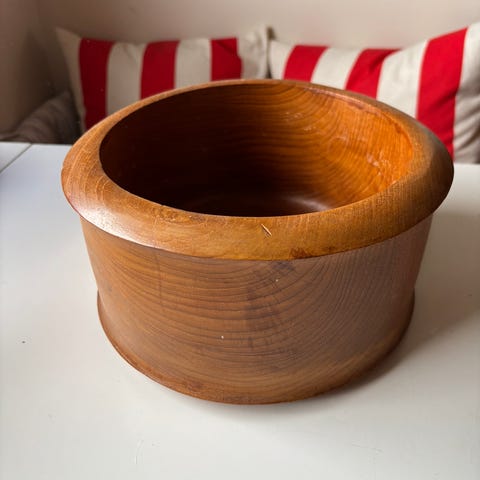 Lav "off center" bolle i nyansert uvanlig bjerk. Mål: Diameter ca 20 cm. Høyde ca. 4 cm. Fordypning: Diameter 14 cm og 3 cm dyp. Mørk «pyntekvist»Ørliten rift i endeveden. Norsk tre, eget arbeid. Behandlet med bivoks. Kan sendes mot fraktkostnader.