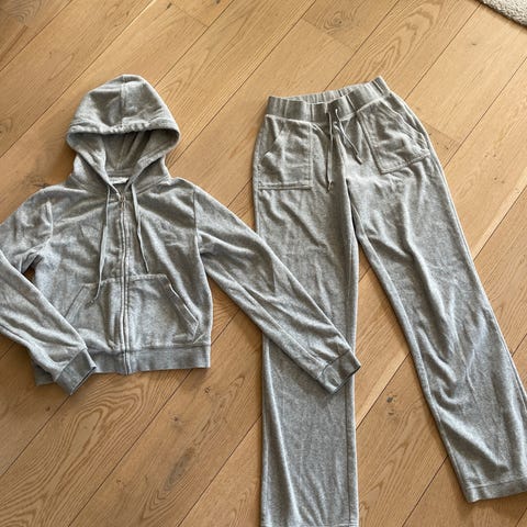 Jakken er brukt mer enn buksen, litt slitt på ermet. Derfor koster buksen mer.