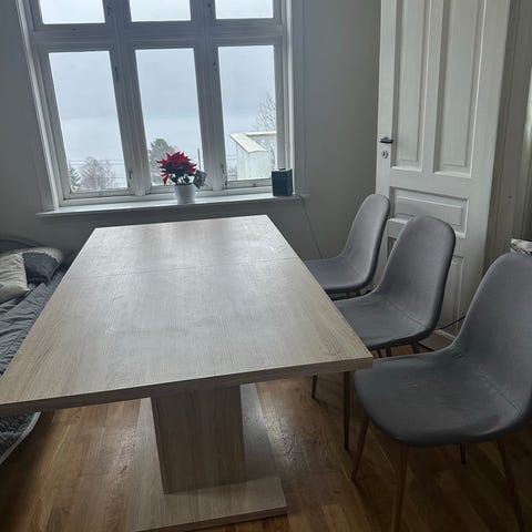 Selger dette fine, spesiallaget spisebordet sammen med stoler.