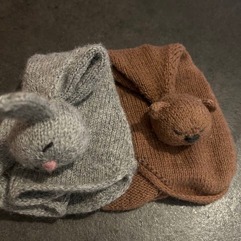 Strikket håndlaget musebamse lengde ca 31 cm. Brukt som pynt.