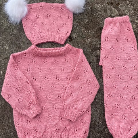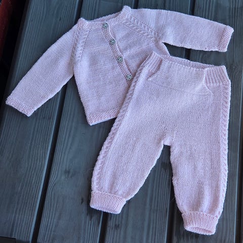 Buksedressen er i glattstrikk med mønsterfelt i sidene. Jakken er strikket i sin helhet i samme mønster som i sidene på buksedressen. Begge plaggene har treknapper.