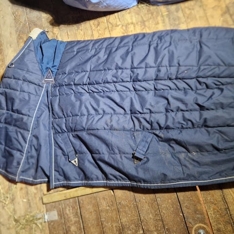 Stalldekken med høy nakke, 200 gram. Liten rift oppe på ryggen (se neste bilde) og mangler gjorder. 150,-