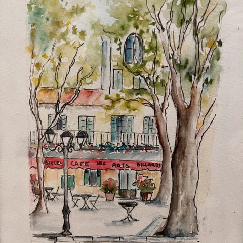 FLOTT AKVARELL MALERI I FLOTT RAMME...FRANSK KUNSTNER...CHRISMAU