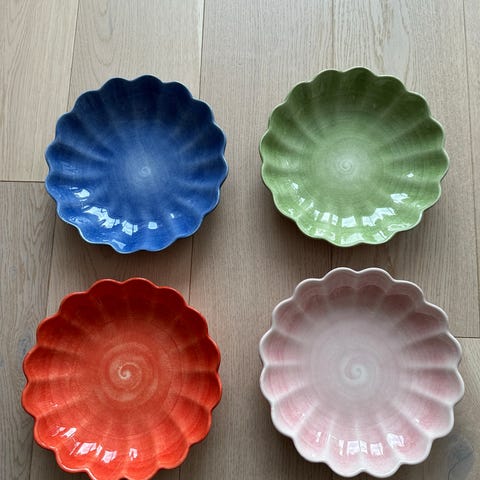 4 stk flotte greskinspirerte skåler. Ca 10 cm lange og 8 cm brede. Tåler oppvaskmaskin. Helt ubrukte da jeg allerede har flere lignende skåler.