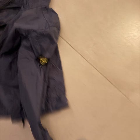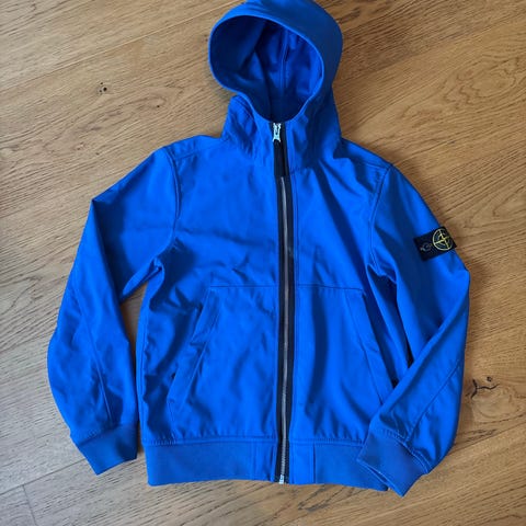 Lengde 57 cm, bredde målt under ermene 47 cm, ermelengde 57 cm. Litt stretch i linning nederst og foran på ermene. To skrålommer m/glidelås. Fast hette. Påkneppet Stone Island kompassmerke på venstre erme.