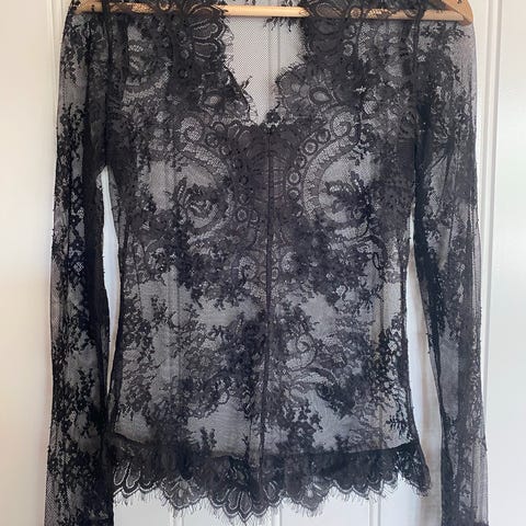 Strikk nede, på ermene og i utringningen, vakkert mønster i stoffet