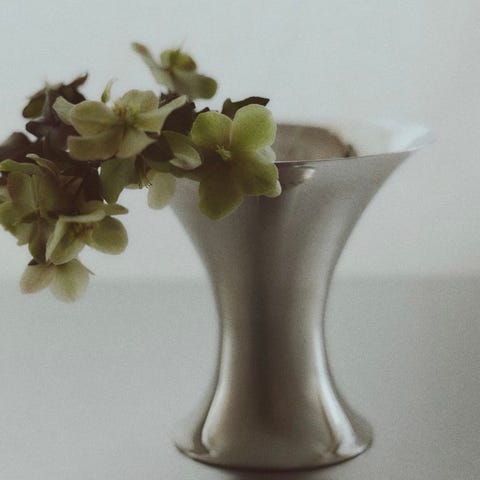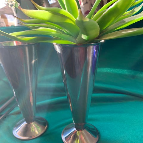 Selger en brukt vase i metall, også dekorativ til fargeblyanter o.l. Høyde 15 cm og diameter på 9 cm